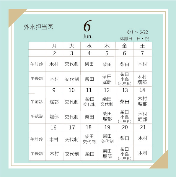 2025年6月1日~22日 外来診察Dr.のお知らせ