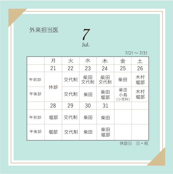 2025年7月21日~31日 外来診察Dr.のお知らせ