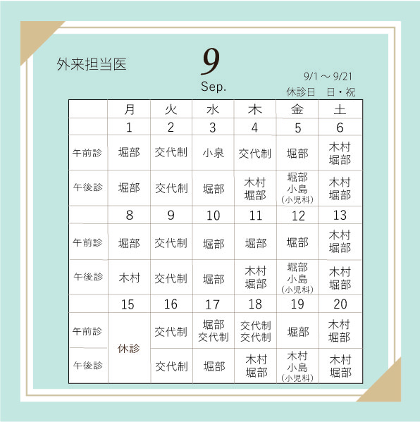 2025年9月1日~21日 外来診察Dr.のお知らせ